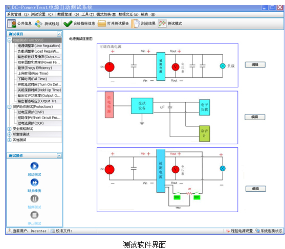 自动测试系统主要应用于生产和研发各类电源产品的工厂和针对产品电源特性、太阳能光伏组件特性测试的实验室和研究院所,其测试对象包括AC-DC电源、DC-DC电源、线性电源、含有电源变换器的电子产品、卫星电源、航空电源总线、汽车电源总线、太阳能电池及光伏组件等。系统测量项目包括电源输入特性、输出特性、阻抗变换特性、电压变换特性、电流变化特性、电源纹波、I-V曲线等特性的测试。系统通过数据采集/ 开关单元完成对不同输出、输入信号的切换和测量,通过电子负载匹配不同的输出单元并进行I-V曲线测试,通过程控电源的输出模拟各种电源现象。