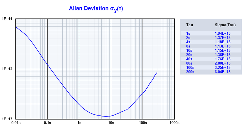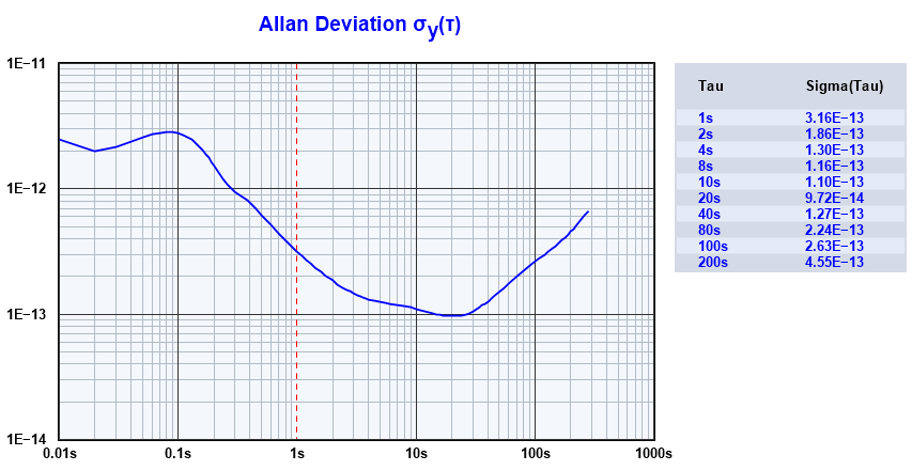 SPO25-160相位噪声及Allan方差测试曲线(频偏<100 Hz时相位噪声与参考输入有关,Allan方差与10 MHz外部参考输入有关,测试曲线为SPO25-160系统噪底)