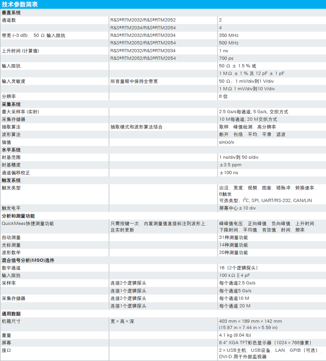R&S RTE系列示波器配有2通道和4通道,带宽为200 MHz、350 MHz、500 MHz和1 GHz。采样率为5 GS/s,存储深度标配为每通道10 Mpts,单通道最大可叠加到40 Mpts (可扩展为每通道 50 Mpts,叠加到200 Mpts)。波形捕获率可达到每秒超过一百万次,确保快速发现信号故障。高精度数字触发系统和ENOB超过7的ADC动态范围,确保精确测量结果。单台仪器即可提供时域、逻辑、协议和频率分析。
